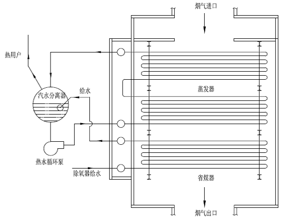 为了提高省煤器的传热温压,省煤器段采用逆流布置即工质与废气流动方向相反,蒸发器段仍采用顺流布置。